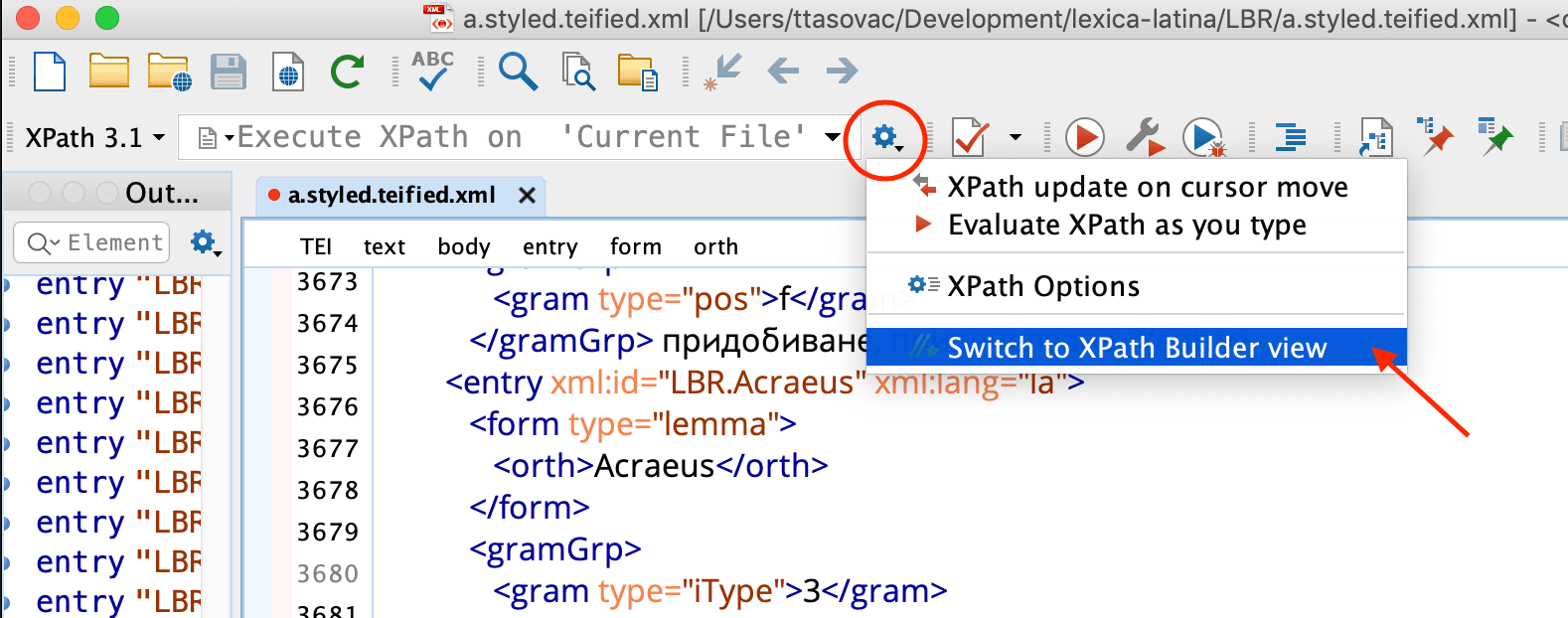 3. in the newer versions of oXygen, click on the icon next to the XPath input field and select the “Switch to XPath Builder View” from the dropdown menu, like this: