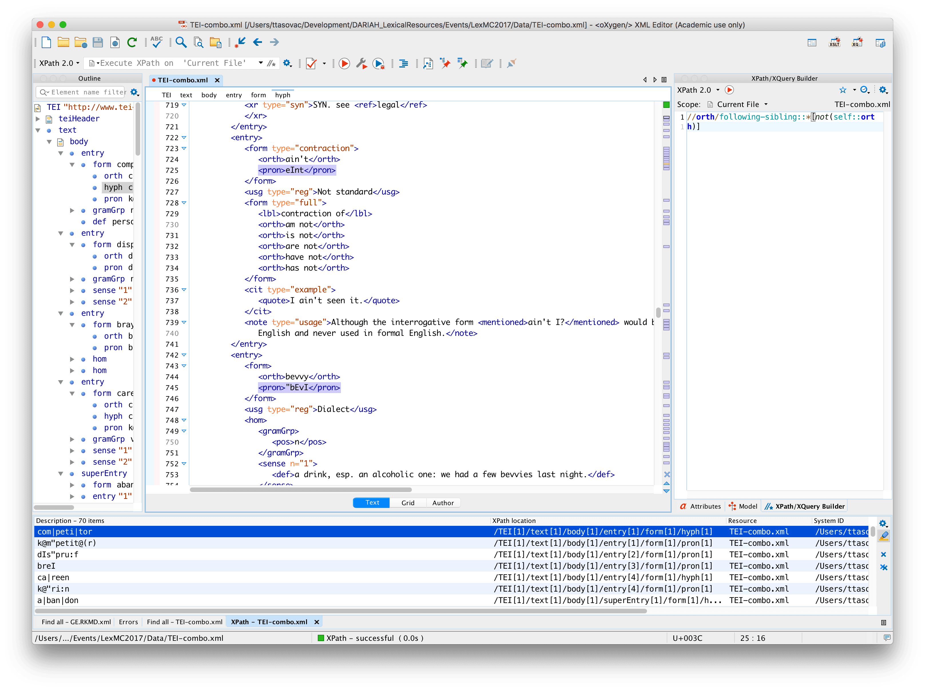 That’s why we had to do something else: in //entry[.//orth="competitor"], the dot inside the square brackets represent the “current node”, i.e. the child of entry, without specifically naming it. It is followed by double slashes to indicate that we are looking for orth anywhere down the tree starting from the current node.